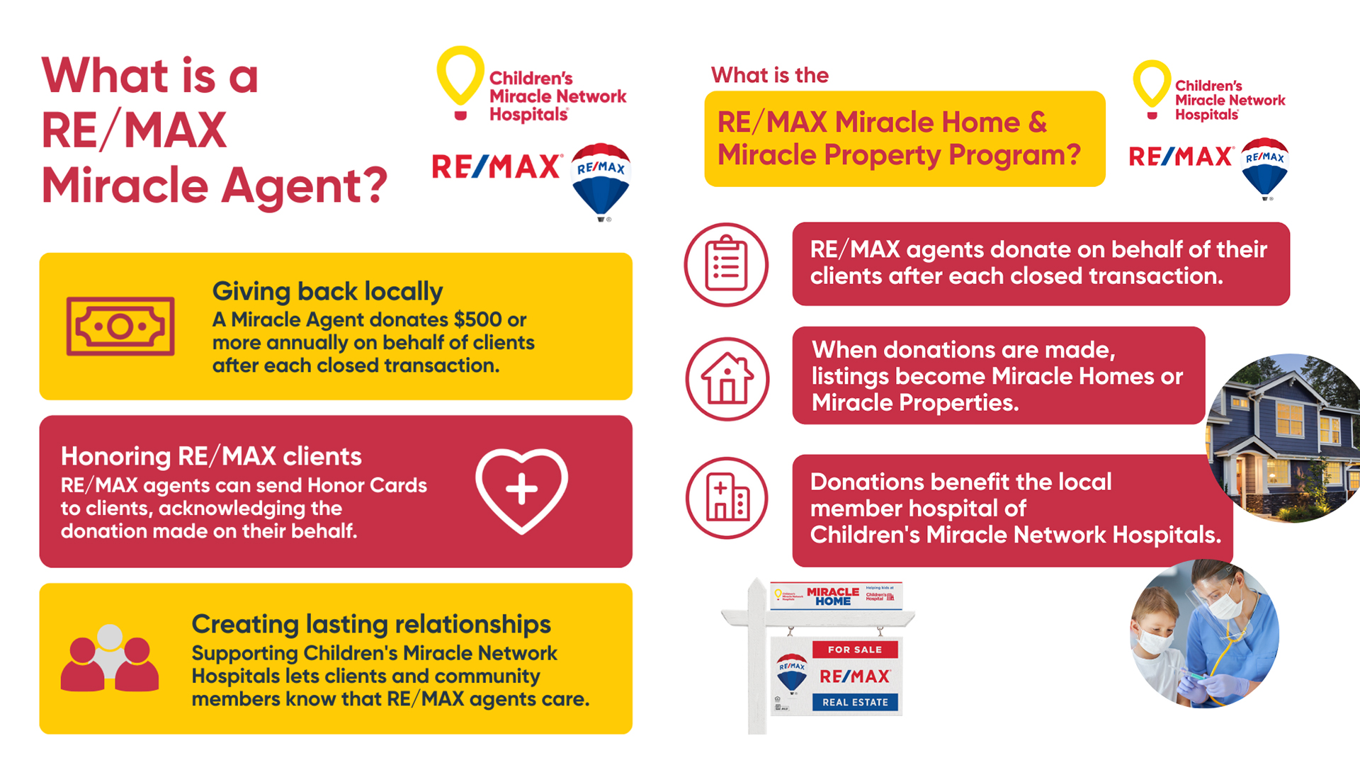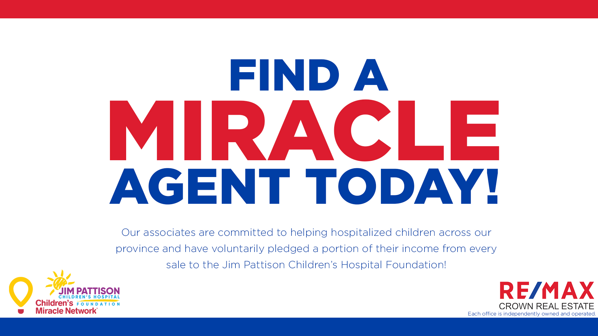 When you see a Miracle Home attached to a RE/MAX agent’s yard sign in Saskatchewan, the agent is donating a portion of the sale to Saskatchewan’s Jim Pattison Children’s Hospital Foundation.